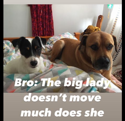 I posted regular updates of Bro sharing my bed with my miffed Jack Russell to alleviate Becky's anxiety about leaving him with me.